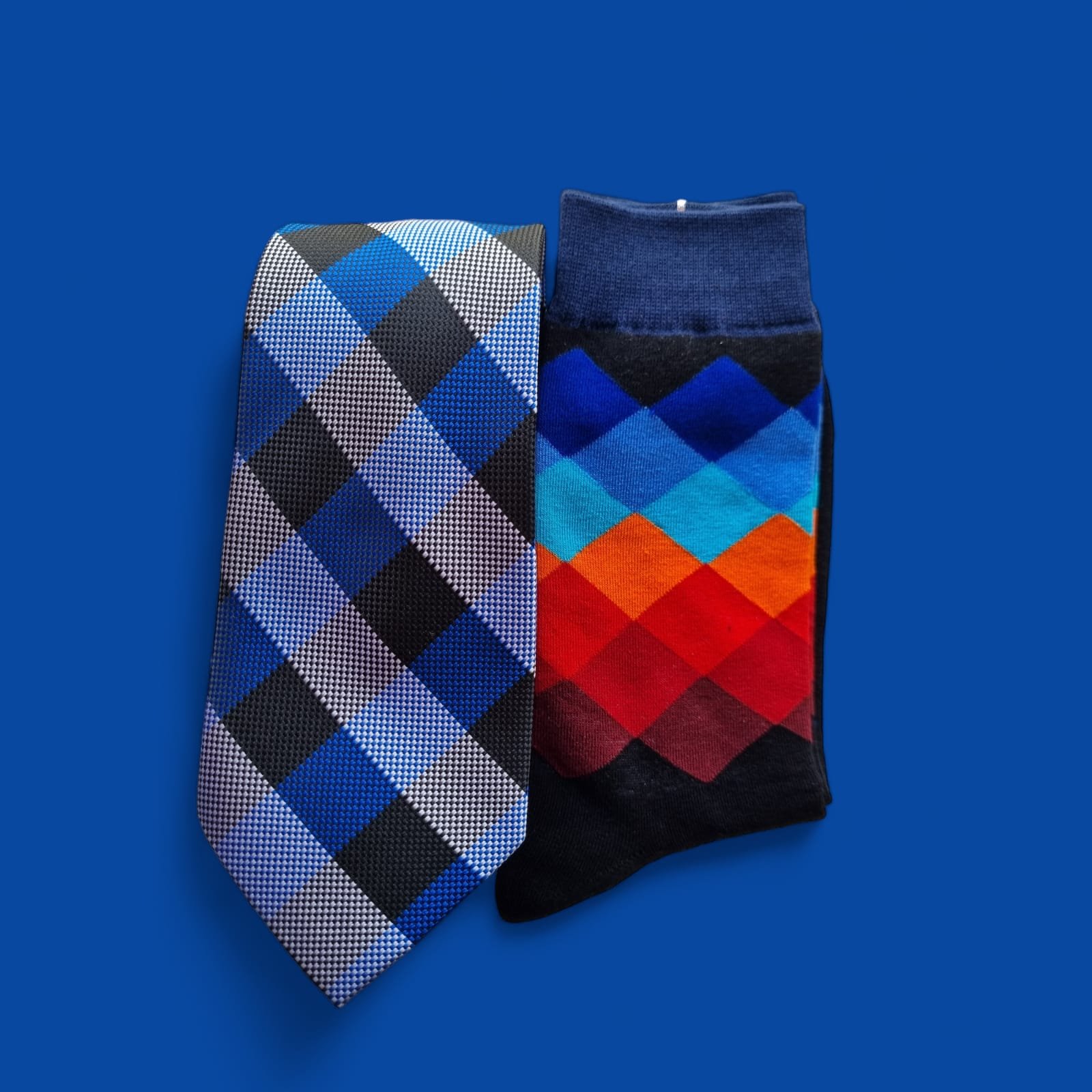 para la corbata de cuadros, implicando un viaje por el estilo y la elegancia.